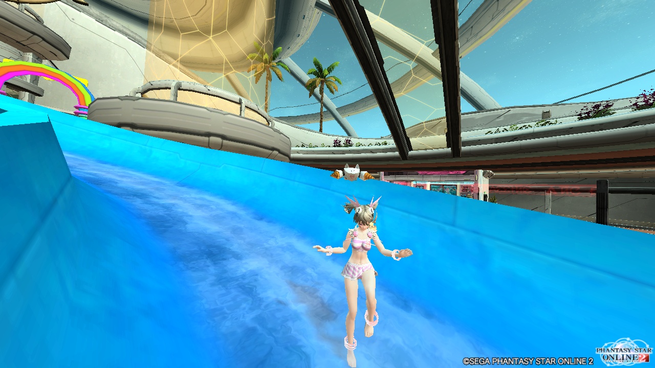 夏だっ!プールだっ!ウォータースライダーだっ!(`・ω・´) 報酬期間も終わり、社会人の皆様も今日あたりから夏休みに入った感じかな~連日の猛暑で毎日のように熱中症のニュースが流れてますが、火山で焼かれ凍土で氷漬けになってるアークスも熱中症にはなるんでしょうか?wまぁきっとフォトンがあれば(略)今回はそんな暑さを吹っ飛ばす・・かもしれないサマーロビーを紹介していきましょう。 ショップエリアのいつもの所←ウォータースライダーが設置されています。この勢いで落ちる所がビニールプールというとんでも設計wまぁフォトンが(略) NPC・フーリエのいるフロアとクーナのいる辺りに入口があって、滑り落ちれます。この勢いで立ったまま下まで滑る驚異のバランス感覚・・アークスすげぇ( ゚Д゚)フォトン・・・(略) ビニールプールに落ちると結構な勢いで水しぶきが上がります。しかし、プールに落ちれない事も多々あります・・足大丈夫なのか・・・フォト・・(略)クエスト直後にシー近辺にオーダー報告に行く時はゲートエリアの真ん中の転送を通ってフーリエの横から滑ると早く行ける気がします。と言っても、誤差程度のものだと思いますが。そして、チームルームも水着イベントに合わせて海岸に設定中です。 ・・・・・この子は海に見えてるイルカを捕獲しようとしてる気がしますが、気にしないでおきましょうw海岸拠点はシンプルなりに雰囲気が良いのでクエストに疲れた時の休憩にどうぞ。それでは皆さん、良い夏休みを~('ω')ノ [1回]PR